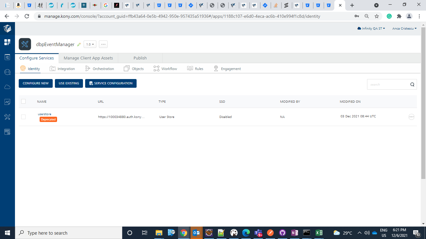 To get the konyPassword and konyUserId, navigate to the Identity Services tab and click on UserStore.