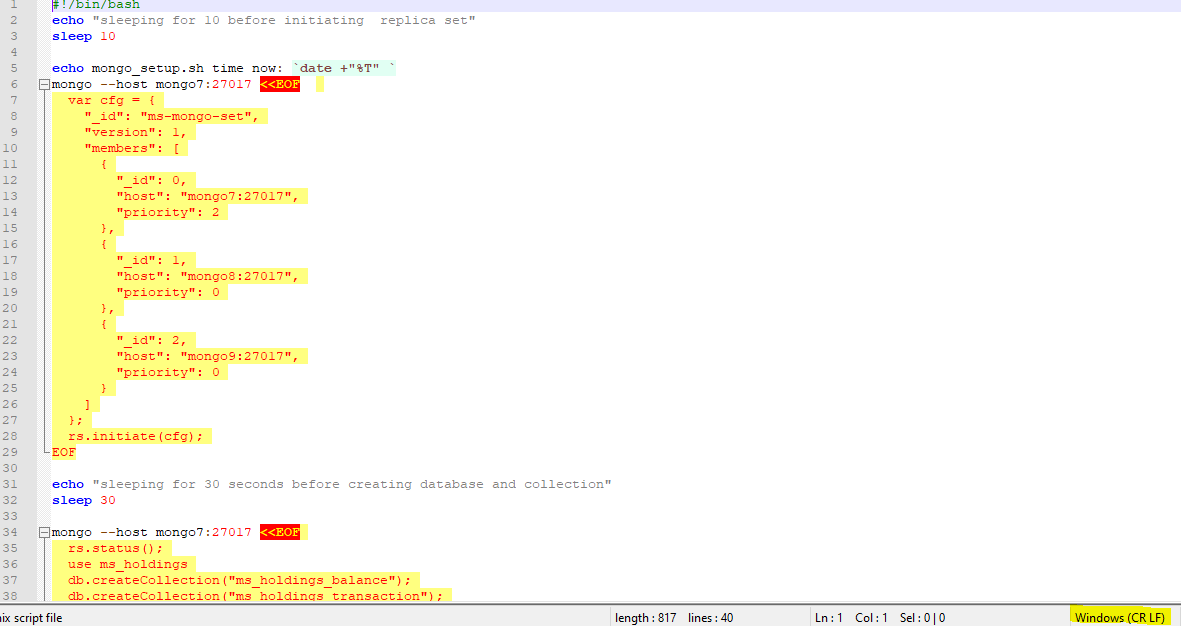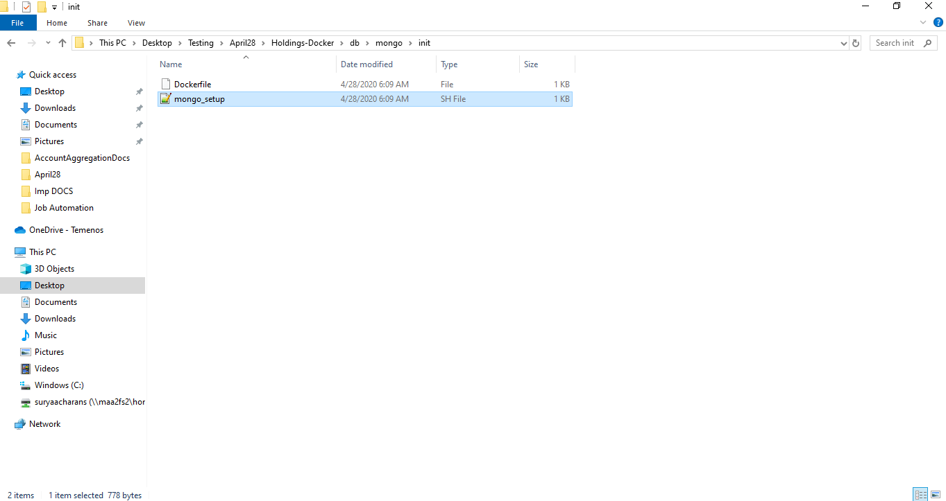 holdingsMongo.yml. - Navigate from the command prompt to the directory where the .bat and .sh files are available and execute the following command which creates an image and docker container for the image.