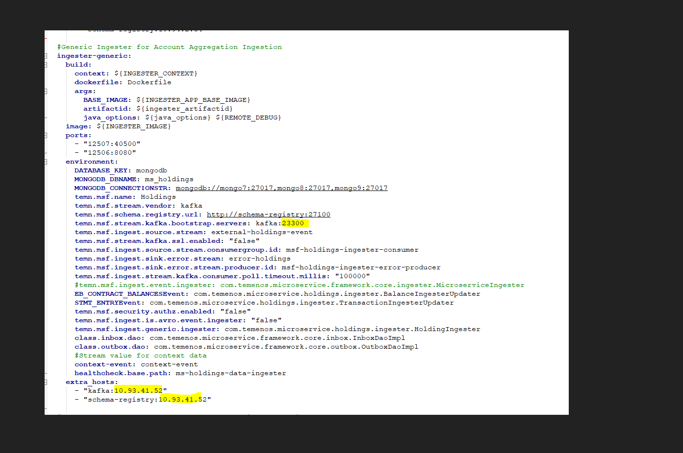 - For Generic External Ingestion, modify the IP and Kafka where Account Aggregation Kafka is running in the holdingsMongo.yml & holdingsPostgresql.yml as follows:
