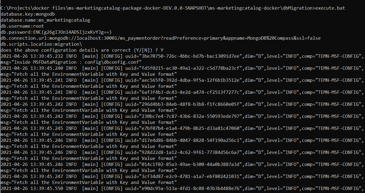 - Navigate to \ms-marketingcatalog-docker-DEV.0.0-SNAPSHOT\ms-marketingcatalog-docker\dbMigration and execute execute.bat in order to load reference data into MarketingCatalog Microservice.
