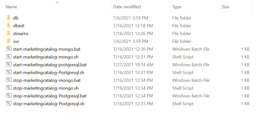 | start-marketingcatalog-postgresql.bat / start-marketingcatalog-postgresql.sh | To deploy all the necessary components for a Microservice including streaming services will be deployed, in order to run the Microservice independently. |