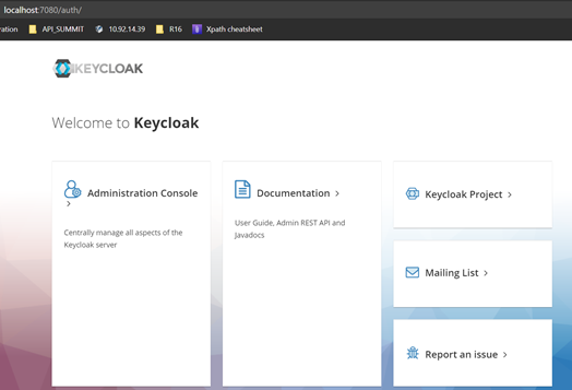 1. In KeyCloak web application (http://localhost:8080/auth/), login to the admin console with the created user name and password (admin/admin).