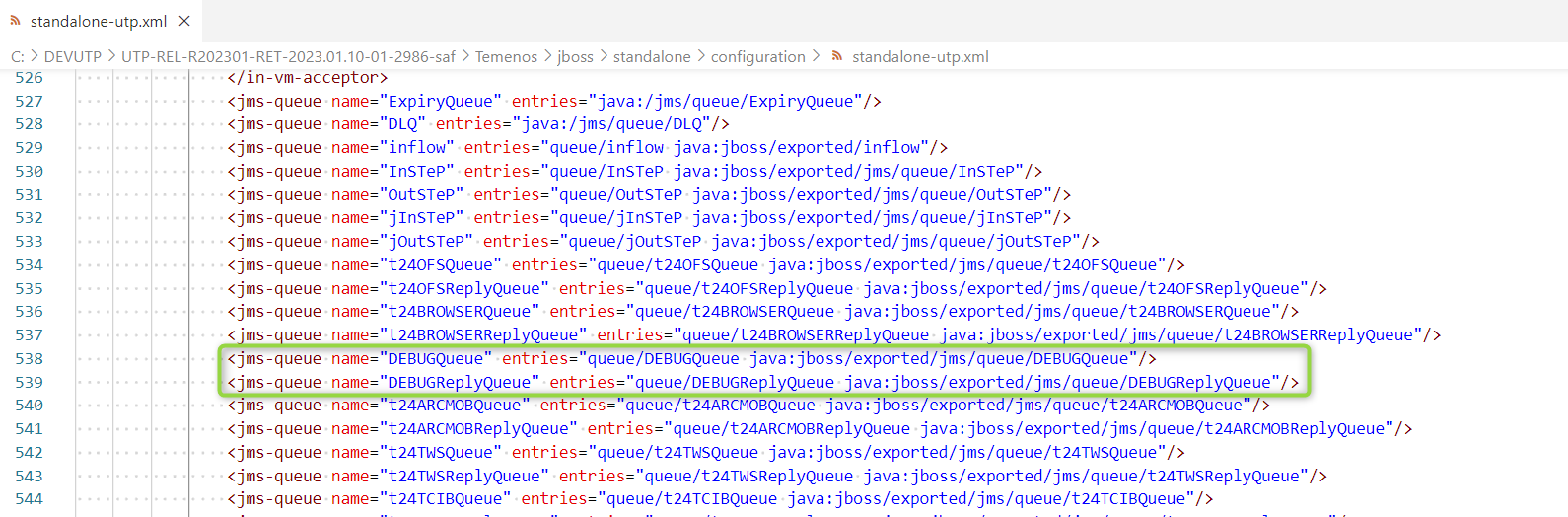 - Configure the queues (DEBUGQueue and DEBUGReplyQueue) in Temenos\jboss\standalone\configuration\standalone-utp.xml