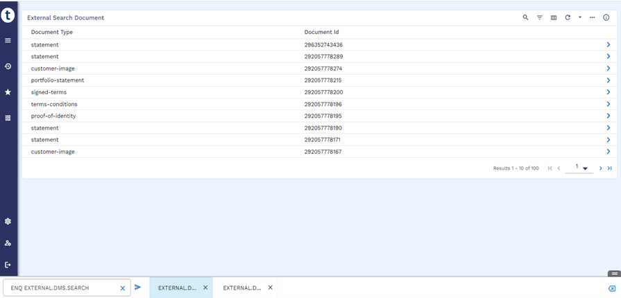 Similarly create enquiries for other search names (ENQUIRY I EXTERNAL.DMS.ALLDOC.SEARCH). And on launching the same (ENQ EXTERNAL.ALLDOC.SEARCH), it retrieves all the documents.